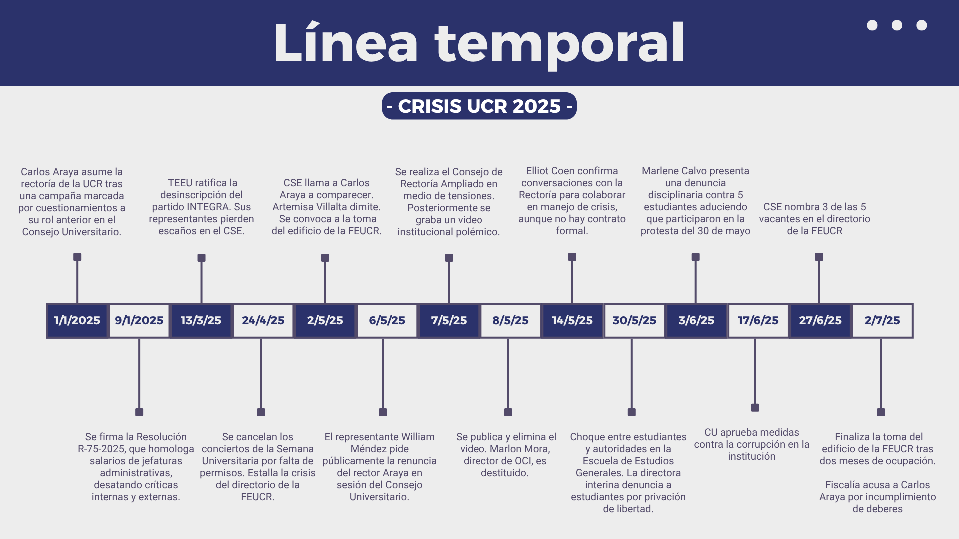 A todo esto se le sumó la cancelación de los eventos principales de la Semana Universitaria 2025 por una mala planificación por parte de la Federación de Estudiantes de la UCR (FEUCR) que radicalizó parte del frente estudiantil. A través de cinco claves, este trabajo periodístico pretende entender todos los frentes que se han abierto tanto a nivel institucional como de cara a la comunidad nacional.