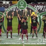 El capitán Edwin Cubillo y el portero Álvaro Santamaría levantan el trofeo del Premundial. Son los únicos jugadores presentes en el tricampeonato 2012, 2016 y 2021. (Foto: LIFUTSAL, tomada de Fedefutbol Guate).